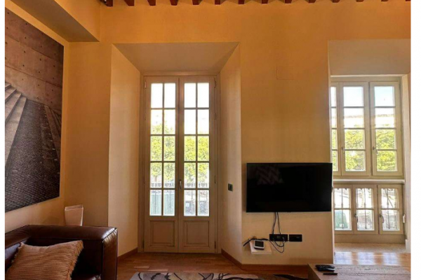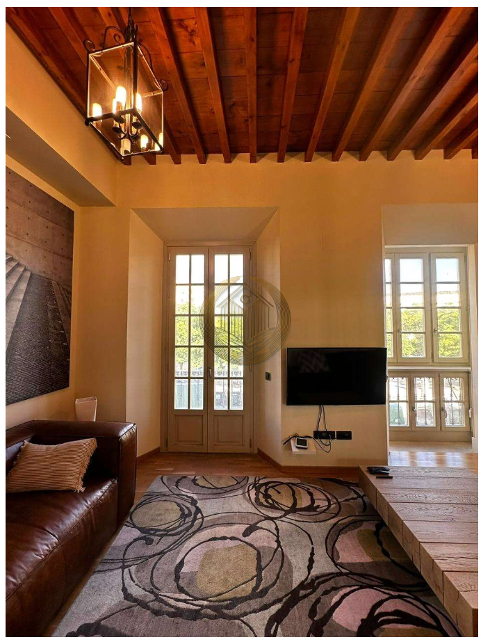 Al entrar, un amplio hall da la bienvenida y conduce a un luminoso salón con grandes ventanales y balcones que se asoman a la plaza: una imagen perfecta para disfrutar de la esencia del centro histórico.