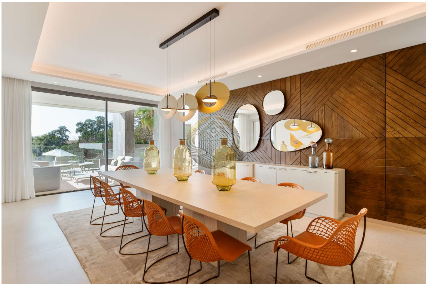 Al acceder por el camino privado, una elegante fachada acristalada y un hall de entrada de doble altura dan la bienvenida. La planta principal alberga un amplio salón con grandes ventanales, comedor para 12 comensales, cocina de diseño totalmente equipada con isla central, sala de TV y despacho. Todas las estancias se abren a una gran terraza con cocina de verano, zona de comedor exterior con barbacoa y una espectacular piscina rodeada de jardines cuidados.