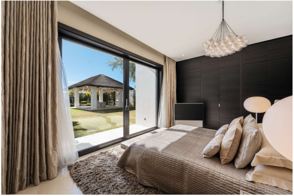 Repartida en tres niveles conectados por ascensor, la propiedad cuenta con 7 dormitorios y 9 baños, así como amplias zonas de ocio y bienestar. La luz natural inunda cada estancia gracias a grandes ventanales y puertas acristaladas.
