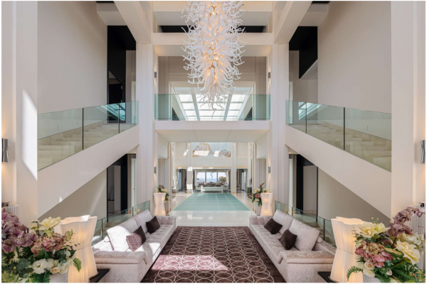 La entrada principal, con lucernario y techo de doble altura, conduce a elegantes áreas de estar, comedor formal, una bodega de diseño y una cocina totalmente equipada con electrodomésticos Gaggenau y Miele.