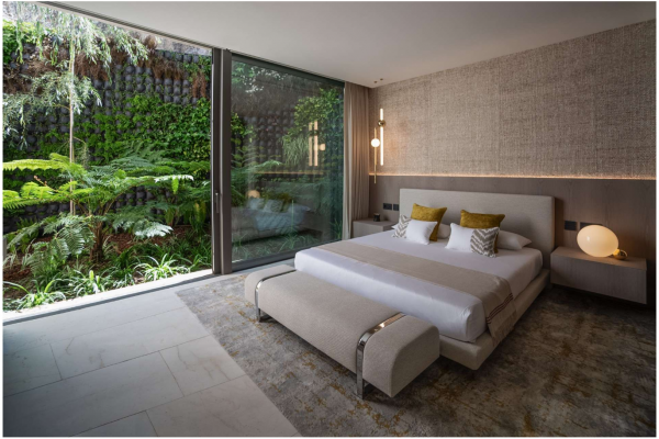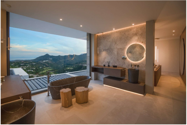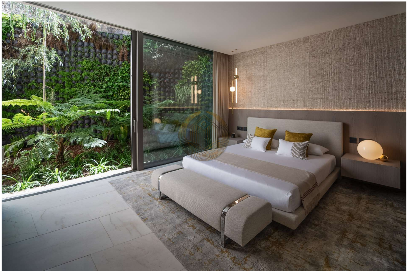 La residencia cuenta con 5 lujosos dormitorios en suite, incluyendo una espectacular suite principal con ventanales de suelo a techo y vistas infinitas, que convierten este espacio en un refugio exclusivo de serenidad.
