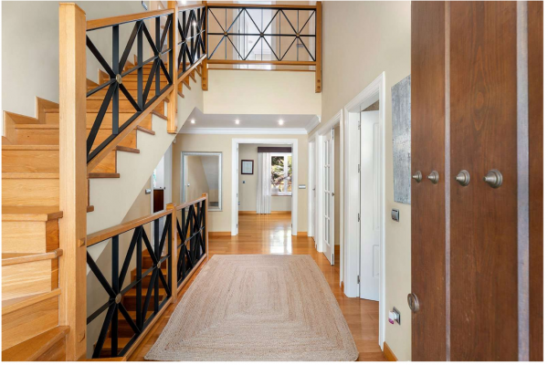 Exclusiva villa de 415 m² con 5 dormitorios, 4 baños y acabados de alta calidad, incluyendo suelos de madera y vigas vistas.