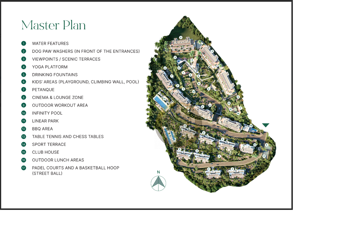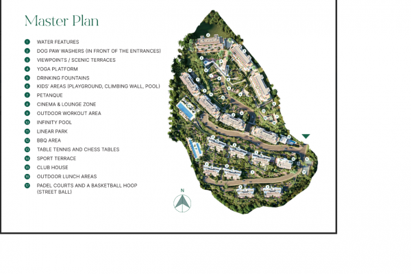 Un concepto de vida elevado que combina bienestar, naturaleza y vistas panorámicas al Mediterráneo, ofreciendo privacidad, serenidad y sofisticación. Sus jardines paisajísticos, senderos sombreados y espacios verdes crean un entorno armonioso diseñado para el descanso y la inspiración.