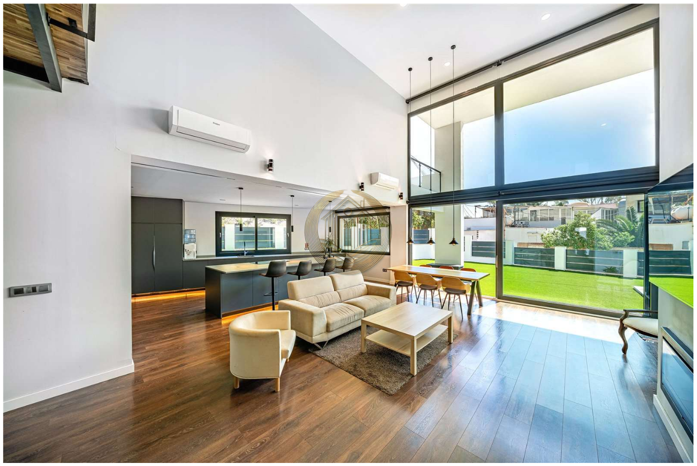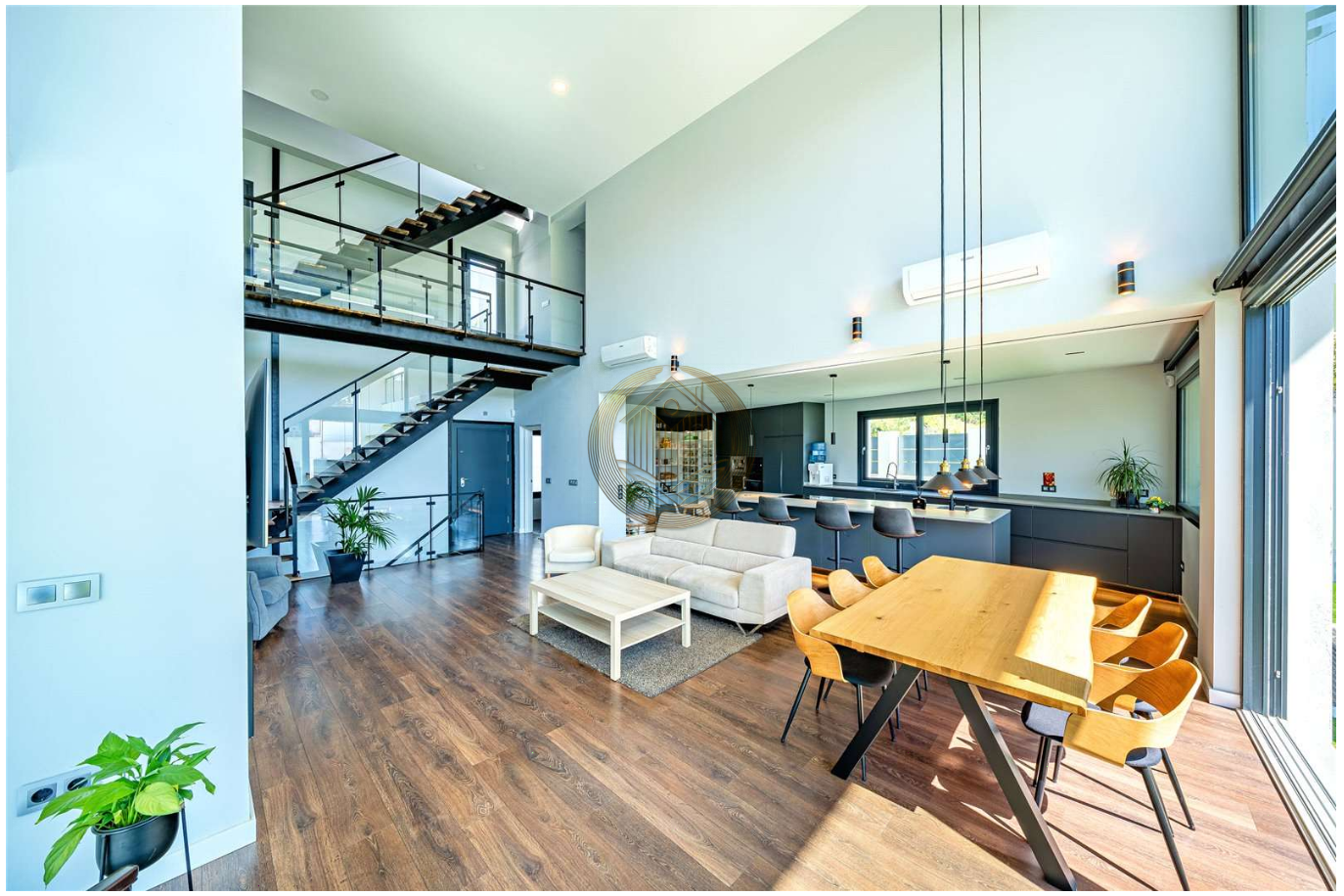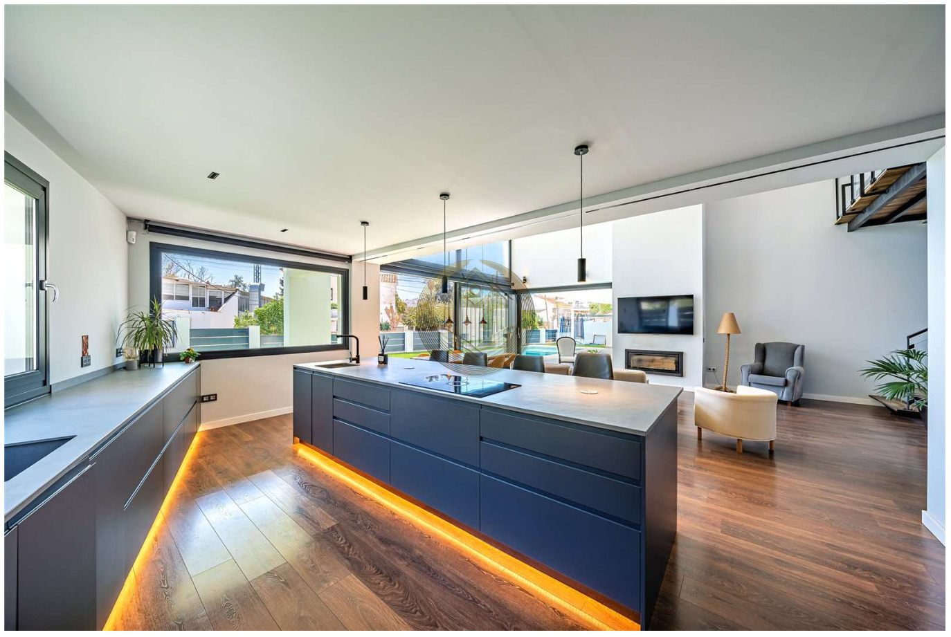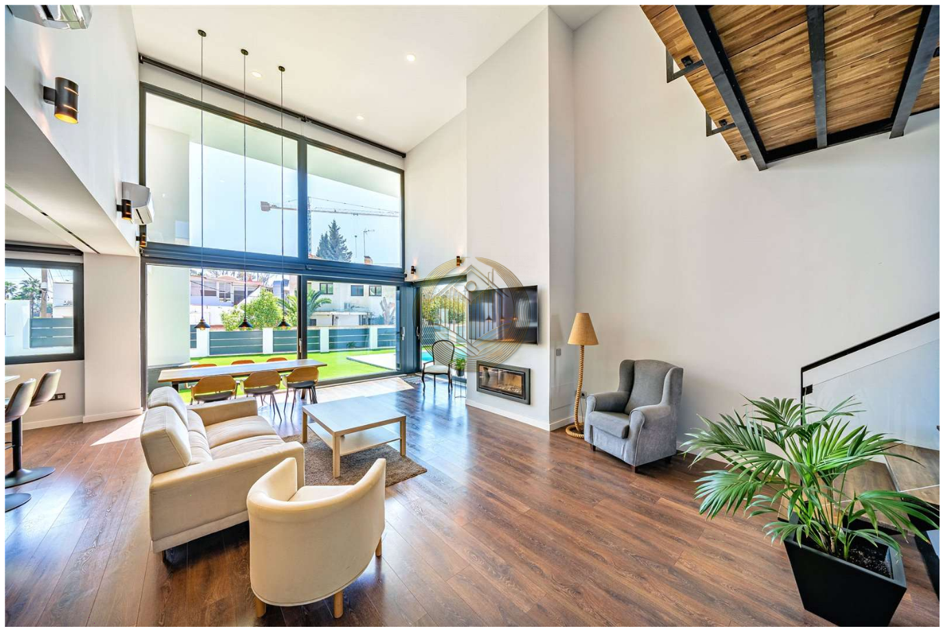 La planta baja ofrece un elegante espacio de concepto abierto donde el salón, el comedor y la moderna cocina con isla se integran de forma armoniosa. Los grandes ventanales, junto con los techos altos, llenan cada rincón de luz natural y permiten disfrutar de vistas al jardín y a la piscina. Desde aquí, se accede directamente a una acogedora zona exterior con porche, jardín y piscina: el escenario ideal para vivir al aire libre todo el año.