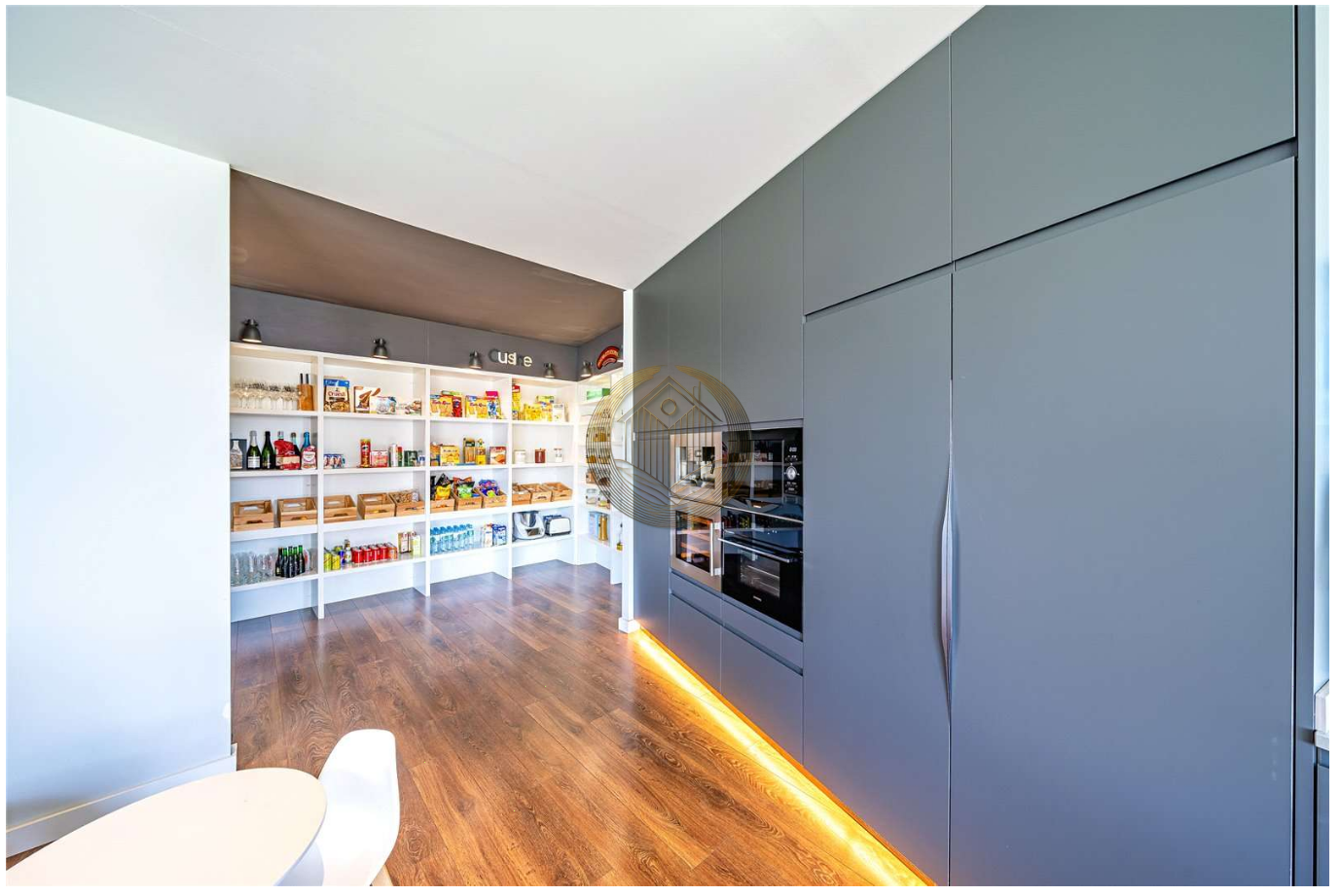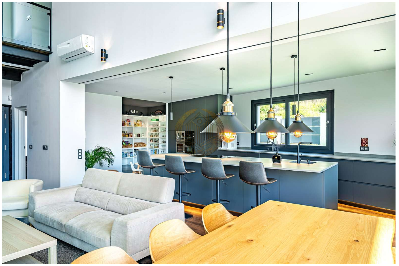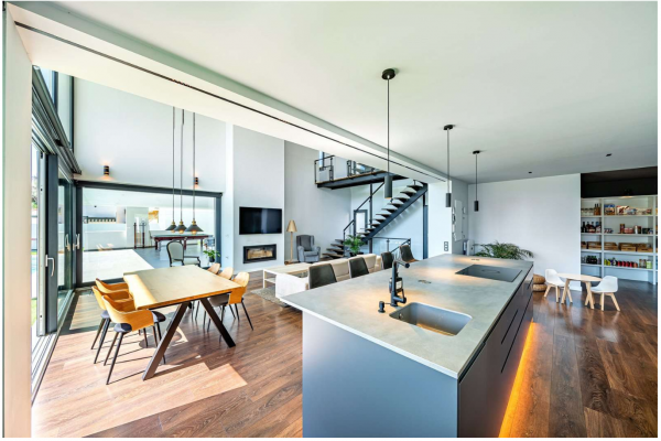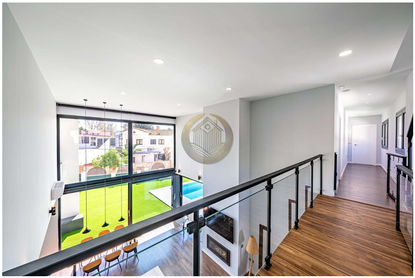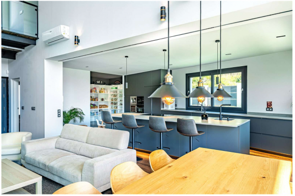 La planta baja ofrece un elegante espacio de concepto abierto donde el salón, el comedor y la moderna cocina con isla se integran de forma armoniosa. Los grandes ventanales, junto con los techos altos, llenan cada rincón de luz natural y permiten disfrutar de vistas al jardín y a la piscina. Desde aquí, se accede directamente a una acogedora zona exterior con porche, jardín y piscina: el escenario ideal para vivir al aire libre todo el año.
