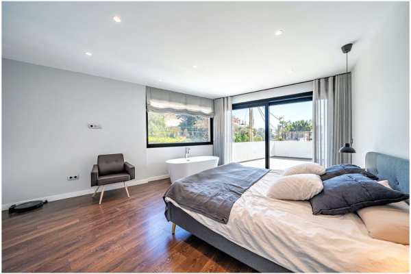 En la primera planta se distribuyen tres amplios dormitorios en suite, todos con armarios empotrados y acabados de alta calidad. El dormitorio principal destaca por su espectacular vestidor. Además, gracias a la amplitud de la planta, existe la posibilidad de crear un dormitorio adicional.